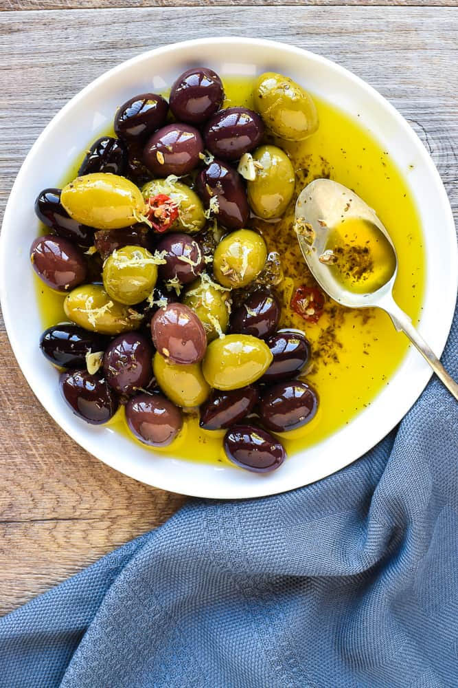 Warm Marinated Olives Gallery Warm Marinated Olives Warm Marinated Olives ½ cup extra virgin olive oil 2 cloves garlic peeled and sliced 2 teaspoons fennel seeds